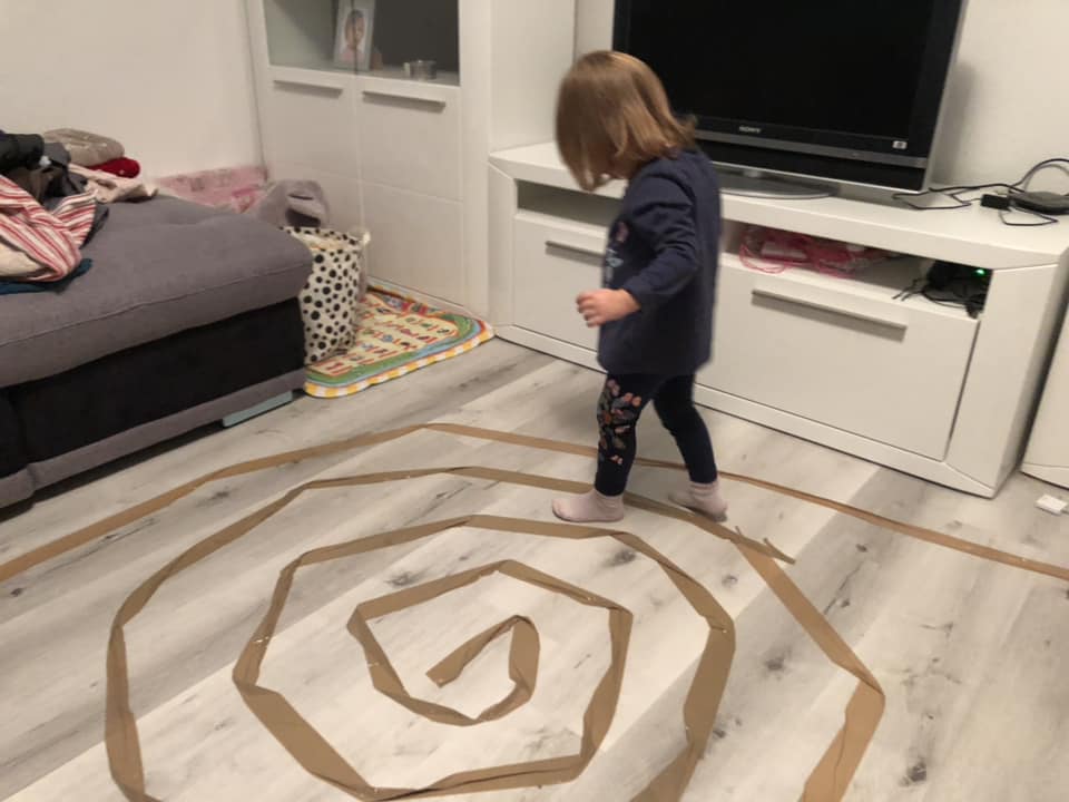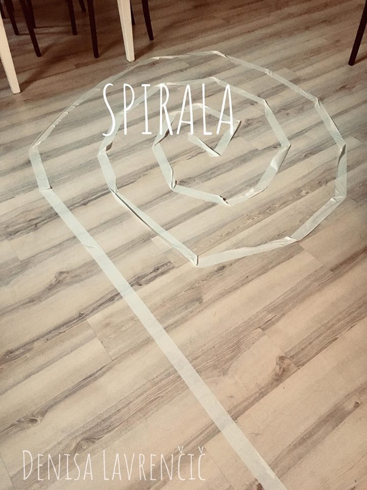 Potrebujemo lepilni trak, škarje. Skupaj s otrokom izdelamo na tleh spiralo. Po spirali bomo hodili, lovili ravnotežje. Kdor pride do konca, ne da bi padel, zmaga. Lahko pa tudi na glas štejete korake in tekmujete, kdo bo prišel prvi v spiralo in nazaj iz nje.