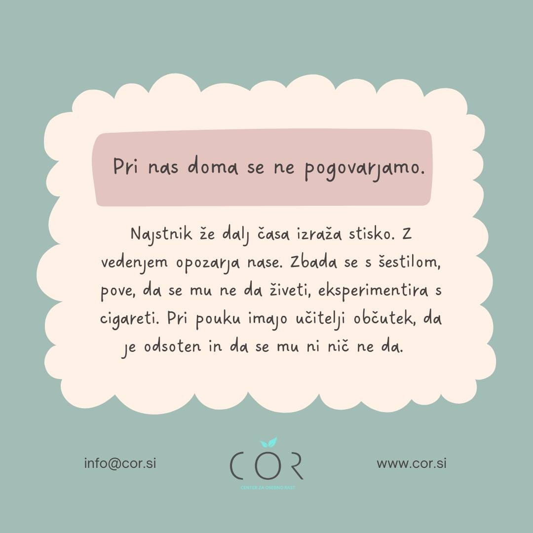 V razgovoru pove, da se doma ne razumejo. Da se starša pogosto kregata, mamo vidi večkrat objokano. Najraje je v sobi, posluša glasbo, brska po telefonu. Nima občutka, da bi ga imel kdo rad, da bi bil komu pomemben. Bilo je več klicev po pomoči.