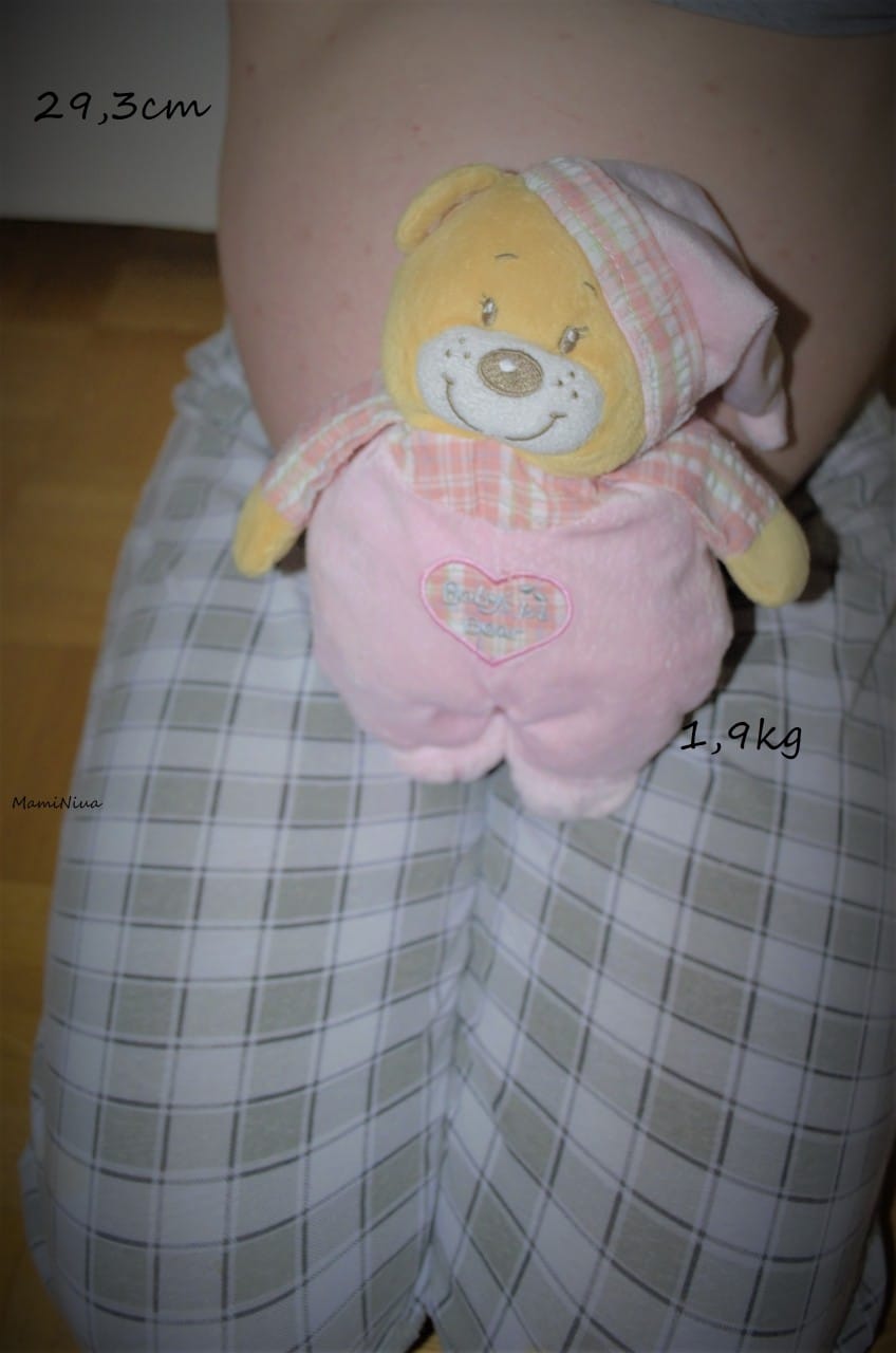 Čisto po naključju sem ugotovila, da naj bi punčka v trebuščku merila toliko kot medvedek njene sestrice, ima torej že približno 29,3 cm in nekje okoli 1,9 kg (sredi tedna je zdravnica povedala, da ima 1840 g, tako je očitno teža res v dobrem povprečju). Obrnjena je na glavico in seveda upamo, da pri tem tudi ostane.