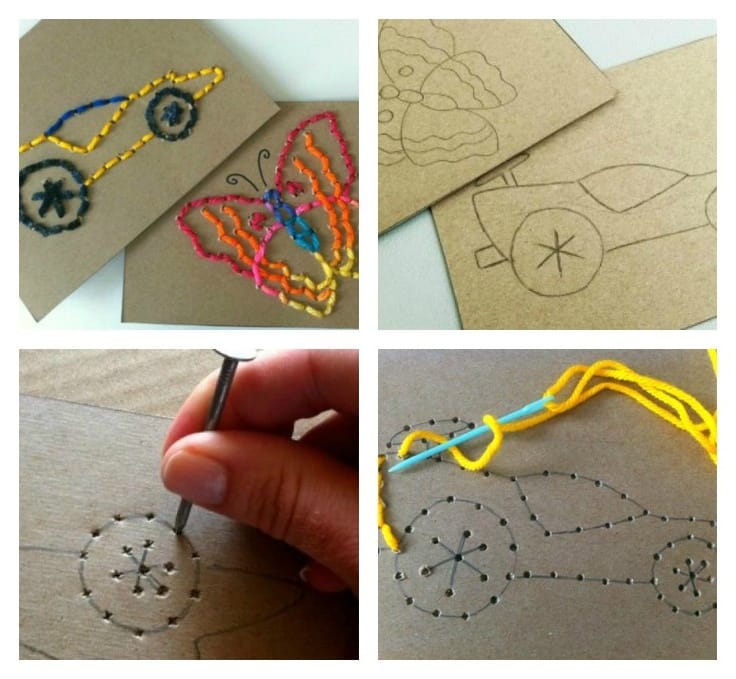 Na karton ali papir narišite različne oblike. Začnite z enostavnimi, da bi se otrok izuril, potem pa nadaljujte z zahtevnejšimi liki. Z iglo ali žebljem (kot na sliki) naredite luknjice, skozi katere je možno pretakniti nit ali volno. Pokažite otroku, kako naj vtakne nit in mu potem pustite, da to sam počne.
