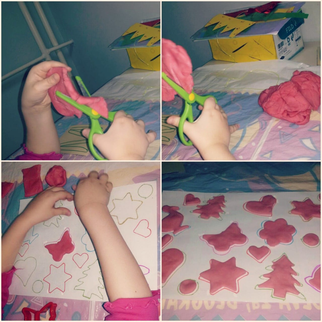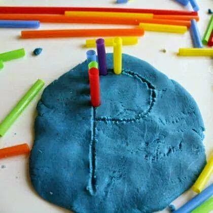 Ta igra nima posebnih navodil. Mečkanje testa, izdelava “kroglic” in “črvov” sta otrokom zanimiva, pomagata pa tudi pri razvoju fine motorike. Testo lahko uporabljate enako kot plastelin. Izdelujete lahko različne figure, lahko uporabite tudi škarje (otroci naj imajo otroške) in iz testa “krojite” različne oblike. Lahko rišete z zobotrebci ali (kot na sliki) postavljate slamice po vnaprej določenem razporedu (od enostavnih oblik do črk).