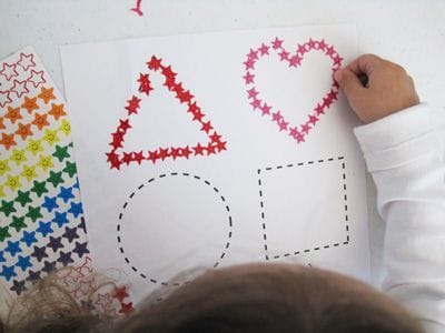 Narišite različne like in pokažite otroku, kako naj lepi majhne like na veliki lik. Tudi to nalogo lahko otežimo. “Vse krogce nalepi na rob kroga”. “Vse trikotničke na trikotnik” itd. Lahko pa v igro vključite tudi različne barve in velikosti, če ocenite, da bo to otroku predstavljajo dodaten izziv in ga bo zabavalo.