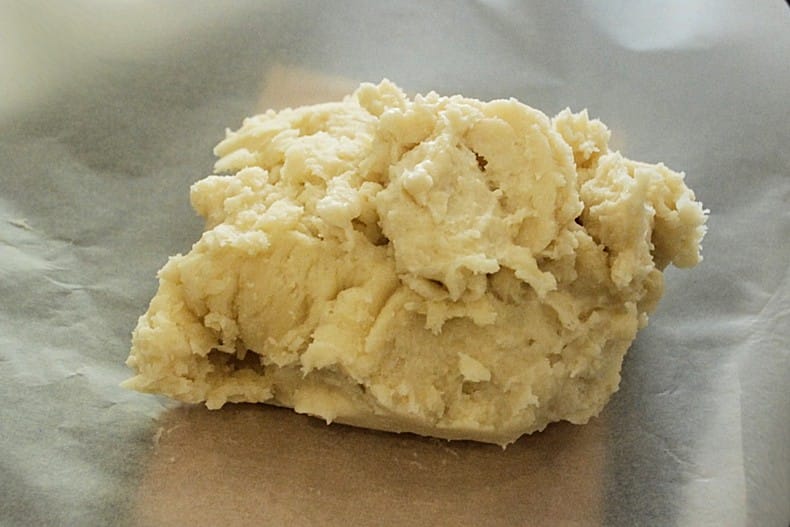 Če uporabimo tudi barvo, jo dodamo proti koncu kuhanja. Ko se začne odbijat od posode, mešamo še malo dokler ne dobimo kompaktno testo – plastelin. Preložimo ga na peki papir, spodaj pa podložimo desko. Pustimo ga 5 minut, da se ohladi.