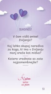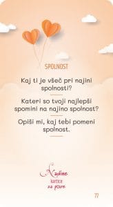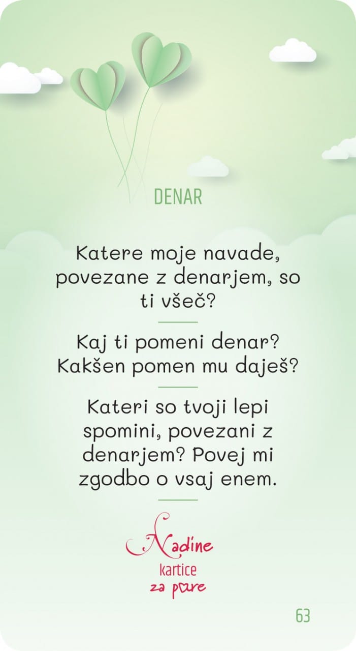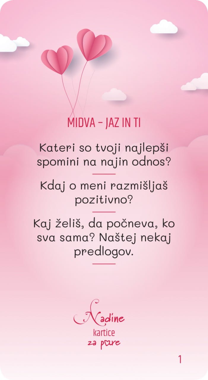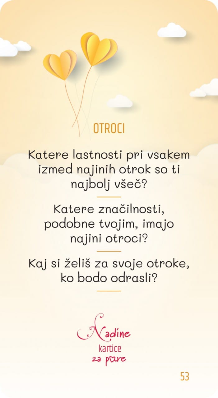 Naj vajin odnos ne tone v površinskih vsakodnevnih pogovorih. Dovolita, da ga s pomočjo usmerjenega pogovora ob Nadinih karticah za pare, poglobita na način, da se zbližata in odprto pogovorita o številnih področjih vajinega odnosa. Pri tem vama želim vse najboljše!