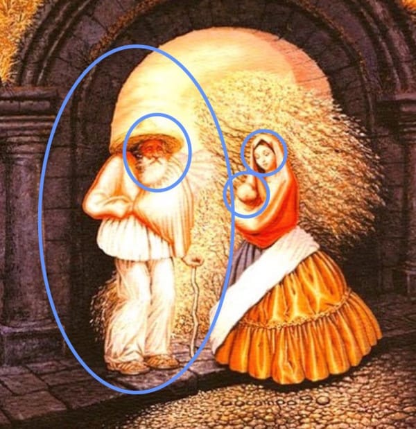 Vidite lahko, da obraz moža vsebuje še sliko drugega starega moža in sliko mlade ženske, ki v naročju drži dojenčka; to so prvi štirje obrazi.