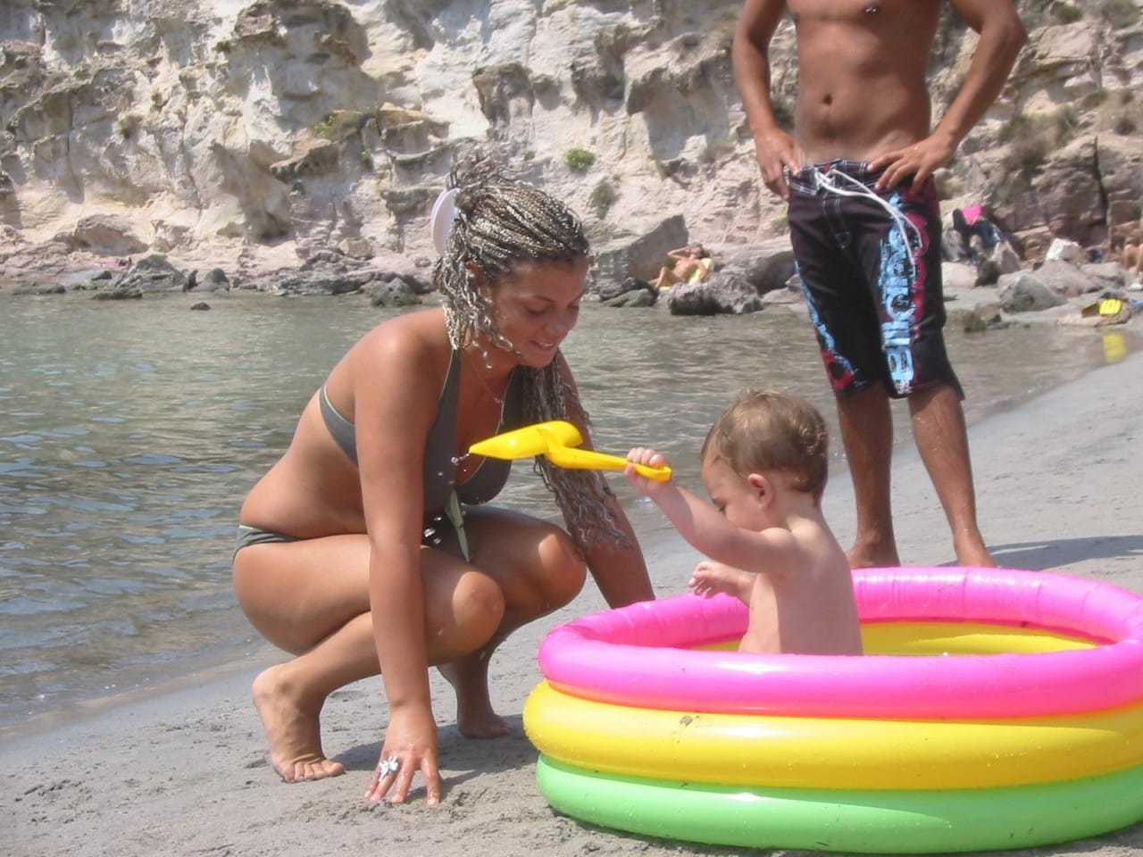 Moj je v vodi brez kopalk, razen v bazenu, tam oblečemo kopalno pleničko, da ne bi prišlo do nezgode. A ko se posuši, ga oblečem kopalke, da ga ne žulijo kamenčki. Ni nimam proti malim nagcem na plaži, mislim, da tako najbolj uživajo.