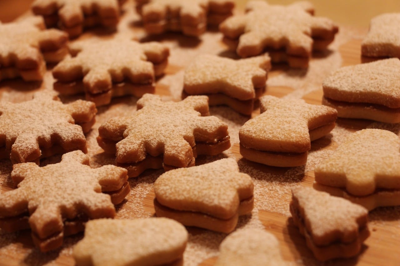 - Ko se cimetovi lincerji ohladijo, jih po spodnji strani premažemo z marelično ali drugo poljubno marmelado in po dva spojimo.
