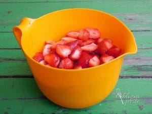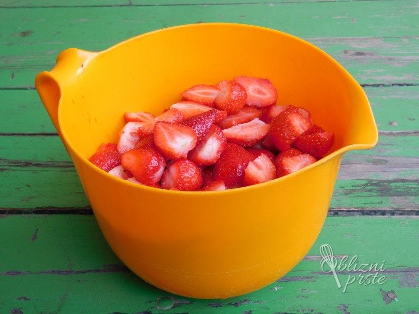 Jagode dobro operemo, odstranimo zeleni del, jih prerežemo in odstranimo vse nagnite dele jagod, da ne pokvarimo okusa marmelade.