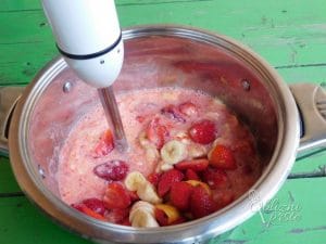 S paličnim mešalnikom že pred kuhanjem vse skupaj zmiksamo, da dobimo tekočo zmes in nam ni potrebno dodajati vode.