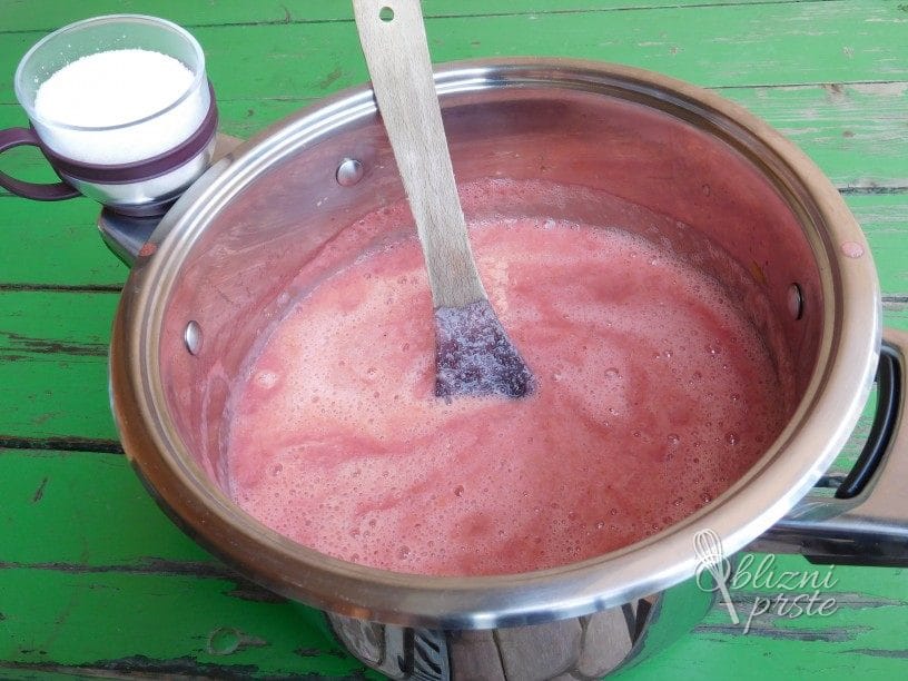 Lonec postavimo na štedilnik in sadju dodamo sladkor, na zmernem ognju, med stalnim mešanjem marmelado kuhamo 45 minut.