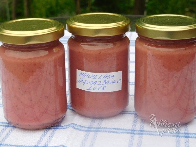 Jagodna marmelada z banano, ki smo ji dodali tudi breskev, je vitaminsko zelo bogata. Z minimalnim dodatkom belega sladkorja in brez dodatkov raznih strjevalnih (želirnih) sredstev, ostane vonj in okus marmelade po jagodah praktično spremenjen. Marmeladi banane in breskev dodamo zato, da je gostota marmelade večja, saj se, zaradi uporabe minimalne količine sladkorja in neuporabe strjevalnih sestavin, marmelada sicer ne bi strdila. Priporočljivo je, da marmelado polnimo v manjše kozarce, odprti kozarec pa shranimo v hladilniku in porabimo v enem tednu.