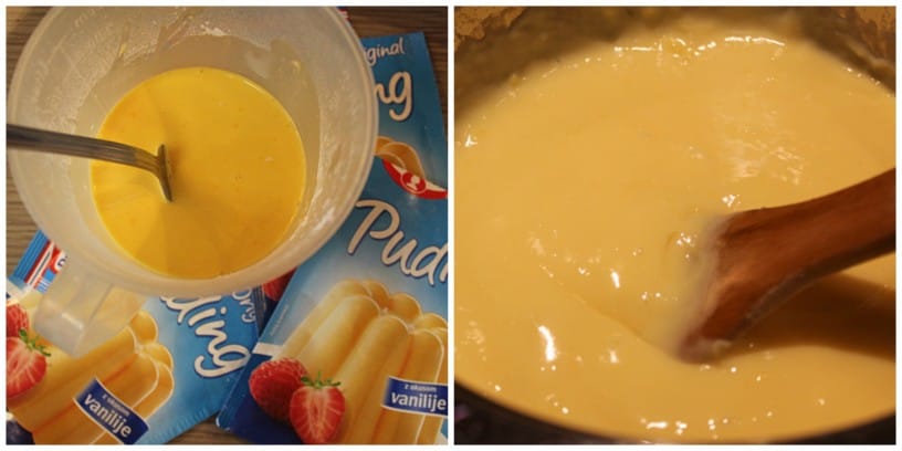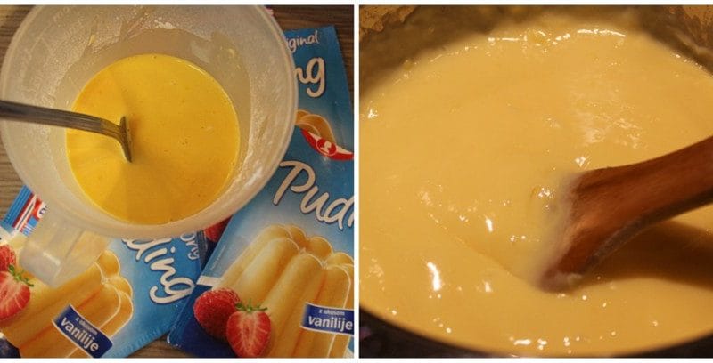 Najprej se lotimo kuhanja pudinga, da se bo do uporabe že primerno shladil. V večji lonec vlijemo mleko in dodamo sladkor ter kuhamo do vrenja. V posodico vlijemo malo mleka, ki smo ga odvzeli od litra in v njem zmešamo tri vaniljeve pudinge. Puding zakuhamo v vrelo mleko in ves čas mešamo. Nato odstavimo od ognja in občasno premešamo, da se na pudingu ne bo naredila koža
