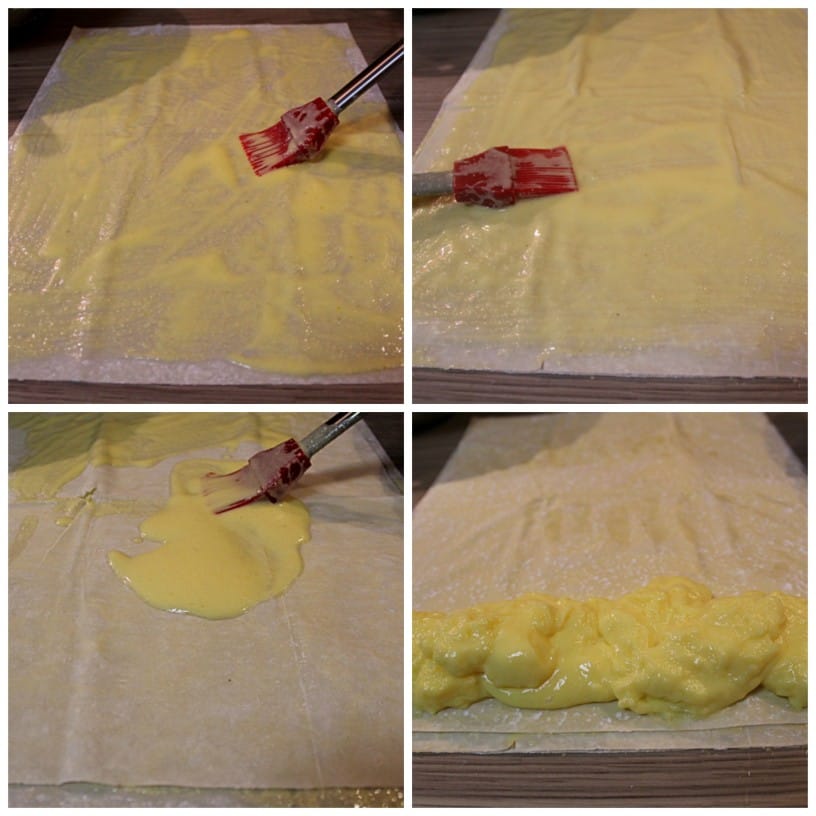 Vzamemo prvi list testa in na njem premažemo 4 do 5 žlic kreme. Nato čezenj položimo drugi list testa in ga enako premažemo s 4 do 5 žlicami kreme. Enako naredimo s tretjim listom testa. Puding razdelimo približno na 3 enake dele in četrti list testa samo na spodnjem robu obložimo s pudingom.