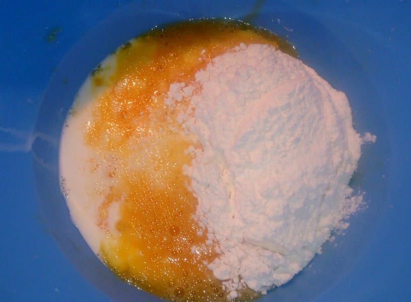 V posodo damo obe jajci. Jajci zmešamo z električnim mešalnikom ali metlico za stepanje. Dodamo sol in olje ter še malo premešamo. Nato dodamo 7 jušnih žlic moke in okrog 200 do 250 ml mleka. Premešamo.