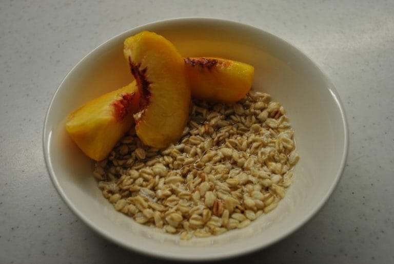 Kosmiči se naj namakajo čez noč ali vsaj nekaj ur. Zjutraj kosmiče odcedimo in jih damo v blender. Breskev olupimo in narežemo na manjše kose, ter jo dodamo v blender.