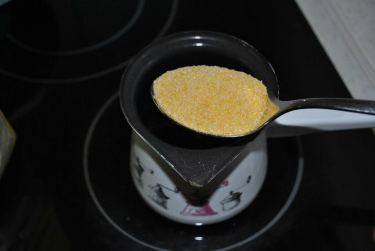 V lončku ali džezvi zavremo približno 6 žlic vode in vanjo zakuhamo polento.