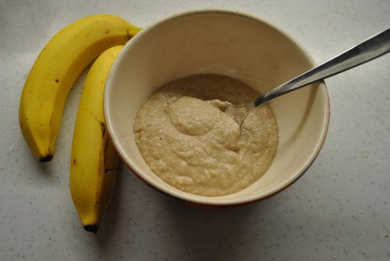 Ko se masa začne zgoščevati jo odstavimo s štedilnika. Banano olupimo, narežemo na manjše kose in damo v blender. Dodamo še polento in vse skupaj zmeljemo.