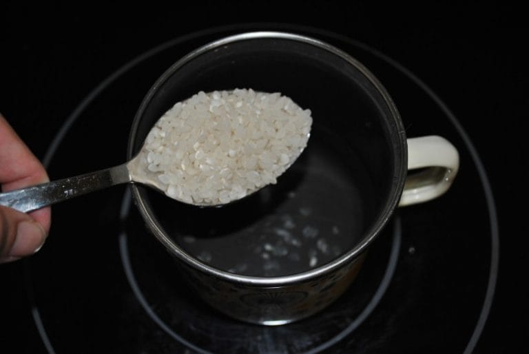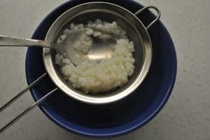 Ko je riž že zelo kuhan, skoraj razkuhan, ga poberemo iz vode in ga pretlačimo preko cedila.