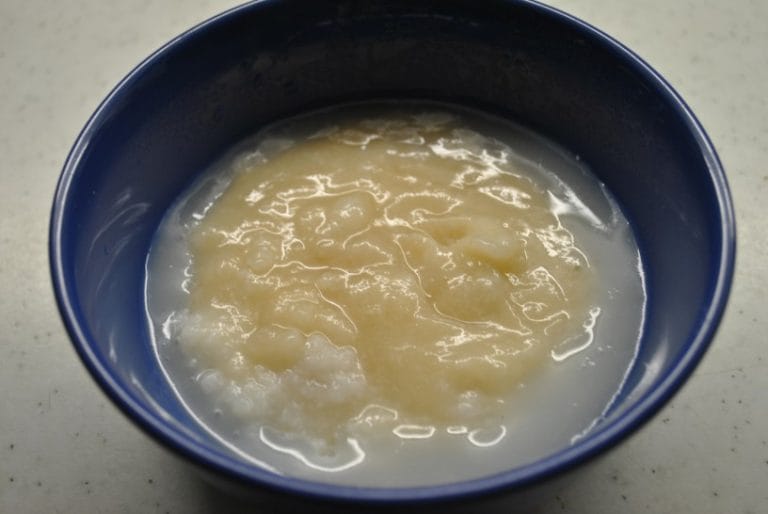 Hruško damo v blender in zmeljemo. Pretlačenemu rižu dodamo sadno kašo.