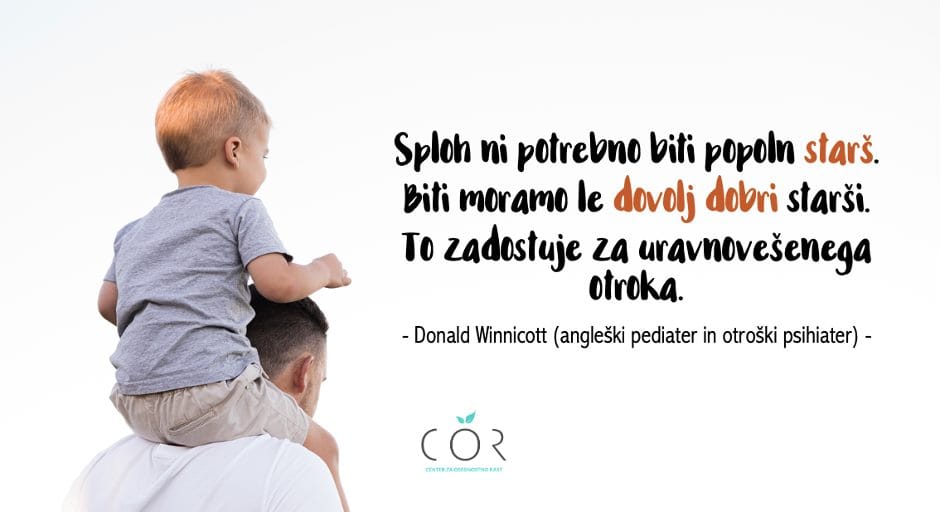 Dokler ste pripravljeni razmišljati o vašem in otrokovem vedenju, iskati, preizkušati in včasih tudi sprejemati nasvete drugih, dokler vam je mar in najpomembneje – STE V OTROKOVEM ŽIVLJENJU AKTIVNO PRISOTNI, velja misel Donalda Winnicotta: Ni potrebno, da ste popolni. Za vzgojo uravnovešenega otroka povsem zadošča, da ste le dovolj dobri starši.