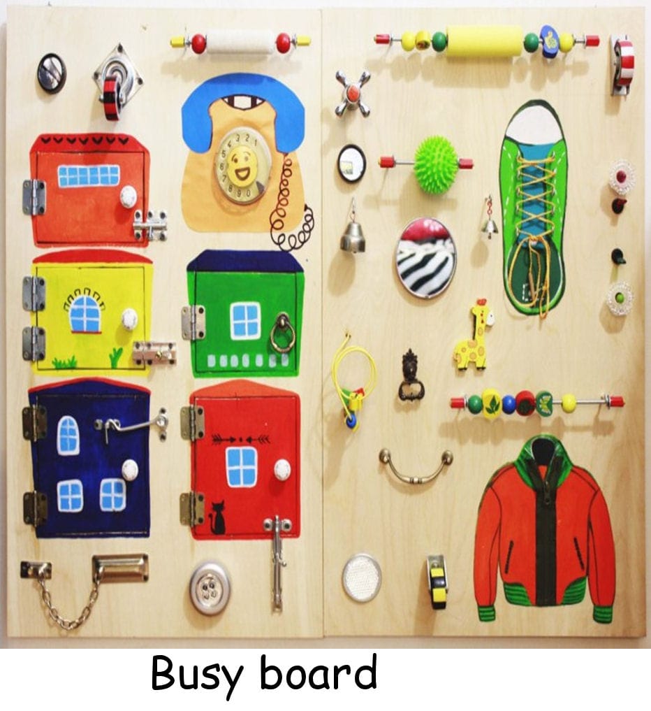 Morda boste želeli ustvariti “busy board” s pravim ključem in ključavnico, zadrgami, gumbi, kolesci itd. Veliko idej lahko najdete tudi na spletu. Zagotovite več različnih košar z aktivnostmi, vse lepo urejene in na vidnem mestu in dovolite svojemu otroku svobodno izbiro po svoji volji. Montessori poudarja učenje skozi vseh 5 čutov, zato se prepričajte, da boste vklučili aktivnosti oz. dejavnosti, ki stimulirajo vsak čut posebej.